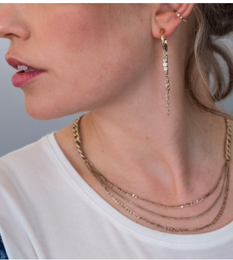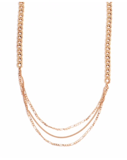 Вроде бы ничего особенного, но смотрится отлично, благодаря переливам нескольких тонких цепочек. Тренд на многослойность начался давно, но и сейчас актуален как никогда. Одновременно строгая и элегантная, подойдет как для вечеринки, так и для повседневной жизни.