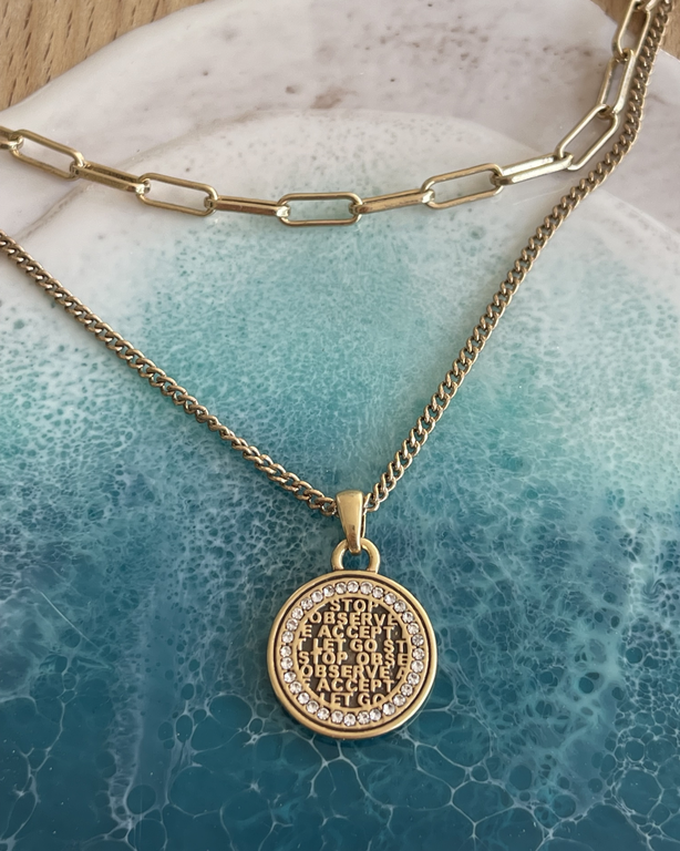 В дизайне колье заложен глубокий смысл для своей обладательницы: кулон украшен словами: "остановись, наблюдай, прими, отпусти". Это хорошее напоминание на каждый день, которое позволяет относится к жизни легче и сохранять внутренний баланс. Колье станет подарком со смыслом для близкого человека.